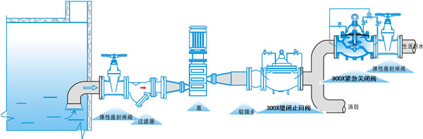 900X緊急關(guān)閉閥用于生活供水和消防供水并聯(lián)供水系統(tǒng)中,正常情況供生活用水,當火災(zāi)發(fā)生時消防用水時,閥門自動關(guān)閉生活用水,確保足夠的消防用水。當消防停止用水時壓力減少,閥門自動恢復(fù)生活用水,該閥使系統(tǒng)無須另設(shè)專門的消防單獨供水管網(wǎng),大大地節(jié)省了工程建設(shè)成本和日常的用水量。該閥控制靈敏、可靠、調(diào)試簡單、使用壽命長。